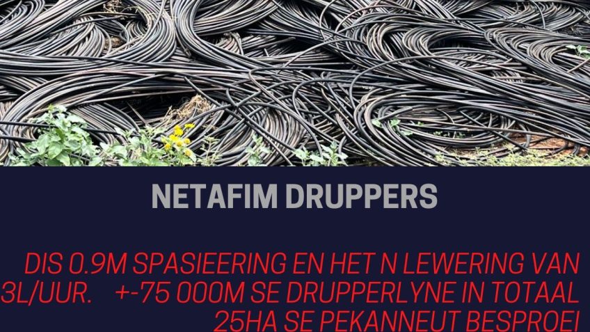 Netafim druppers Dis 0.9m spasieëring en het n lewering van 3L/uur. +/- 75 000m se drupperlyne in totaal25ha se pekanneut besproei R 65 000.00 + Btw vir Als