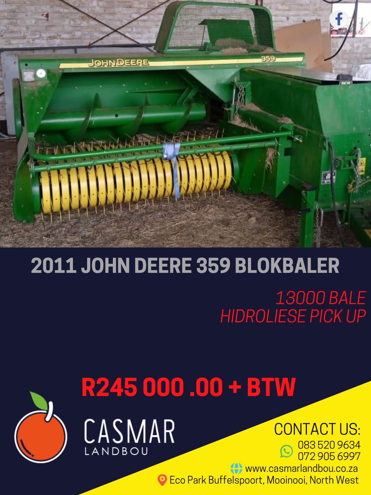 2011 John deere 359 Blokbaler 13000 bale hidrliese pick upR245 000+Btw