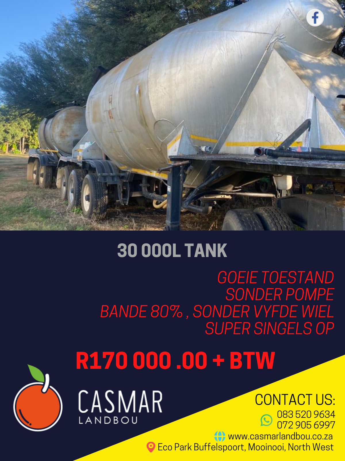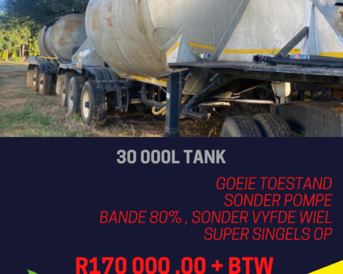 30 000L tank goeie toestand sonder pompe bande 80% sonder vyfde wiel supper singels op R170 000.00 + btw