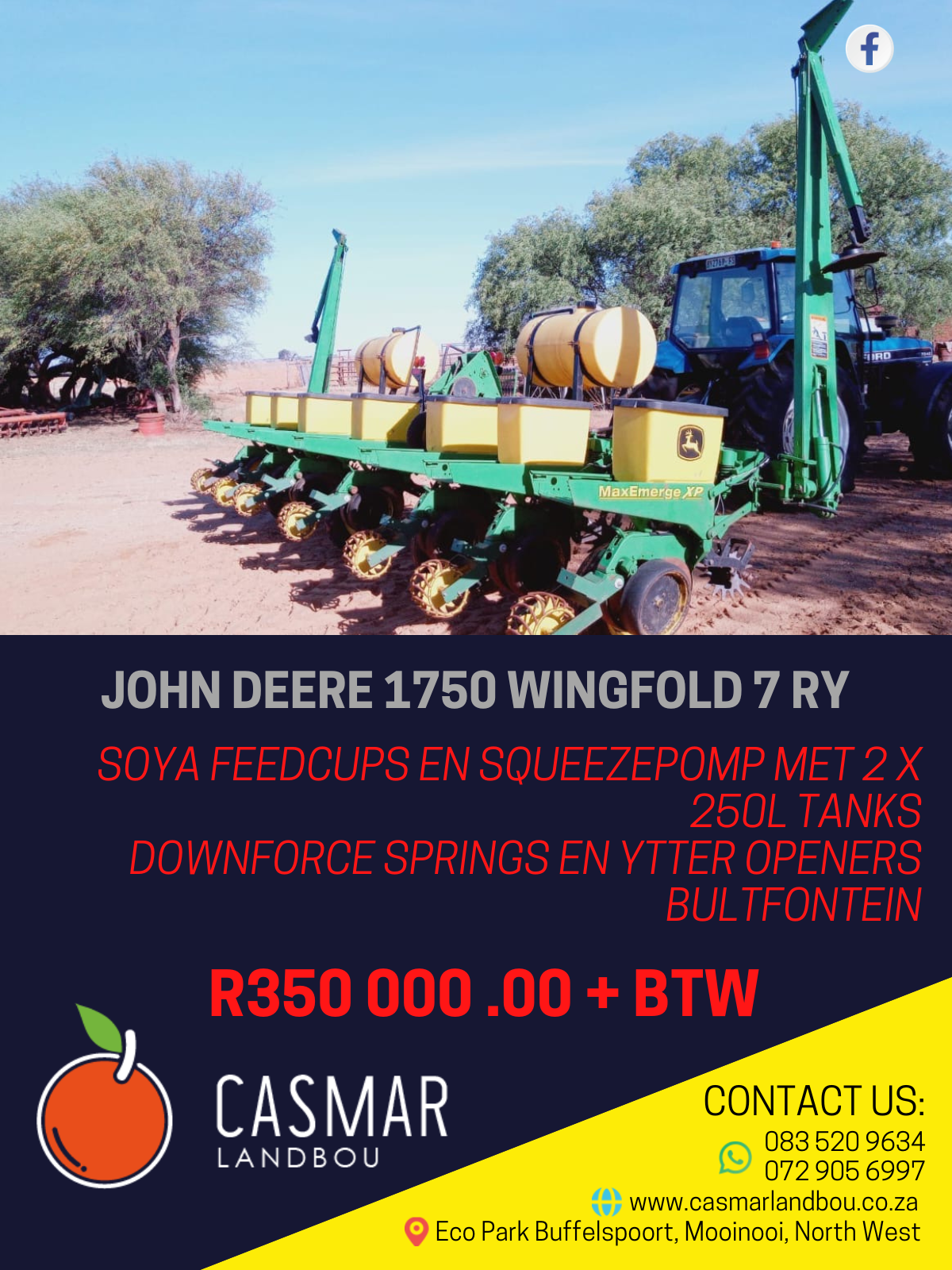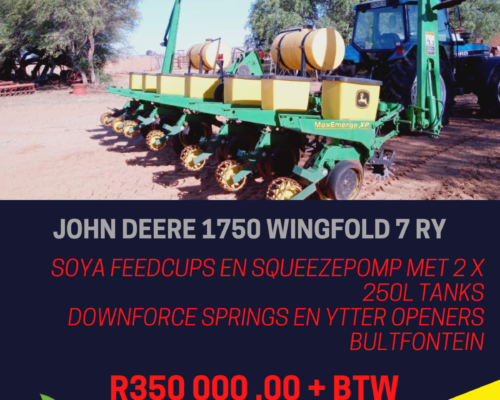 John Deere 1750 Wingfold 7 Ry Soja feedcups en Squeezepomp met 2 x 250l Tenks Downforce springs en Ytter openers Bultfontein