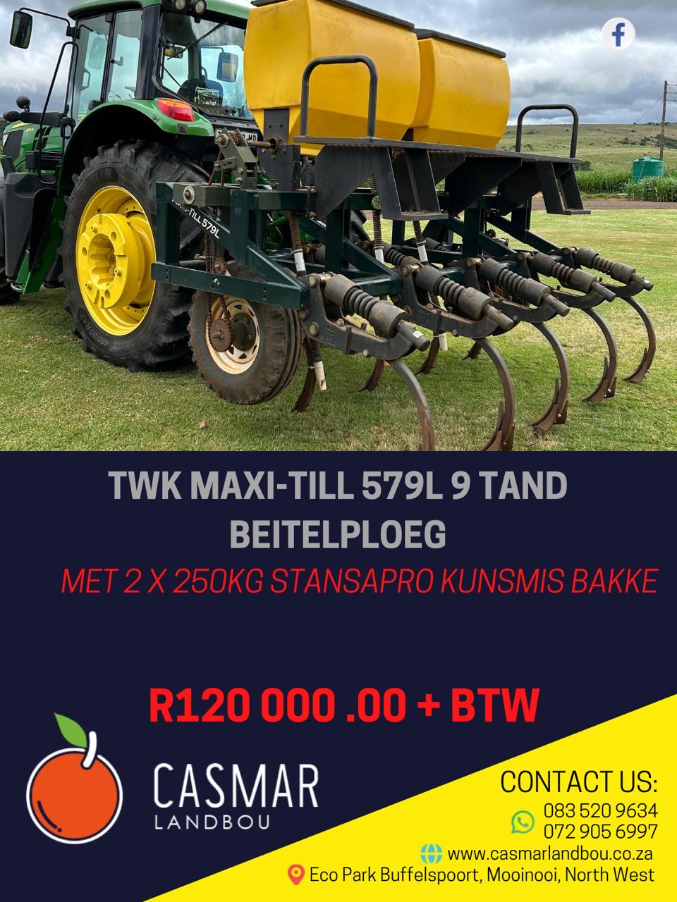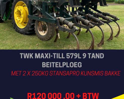 TWK Maxi-Till 579L 9 Tand Beitelploeg met 2 x 250kg stansapro kunsmis bakke R120 000+Btw